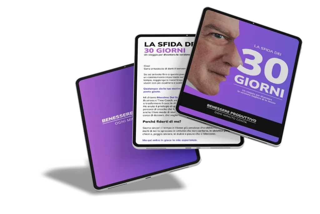 Il Benessere Produttivo non è un sogno irraggiungibile: è una strategia concreta per eliminare il superfluo, riconnetterti con i tuoi veri obiettivi e creare un sistema personale che ti restituisce energia, lucidità e potere decisionale.